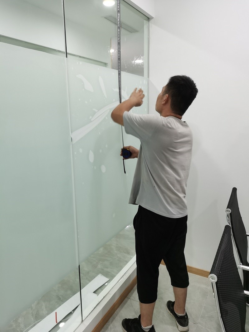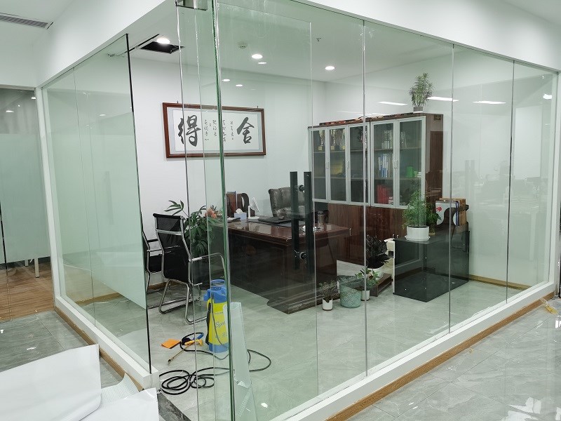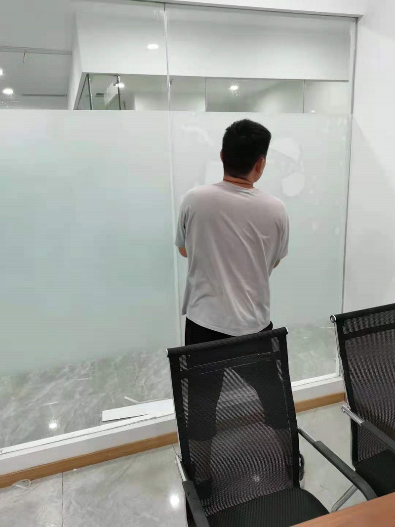 3.  案例介紹:辦公室玻璃隔斷,為了室內更好的采光,但是透明玻璃隱私性欠缺,最終選擇邦臣窗膜,透光不透明磨砂膜,既能保證光線,又能保證辦公室的隱私性